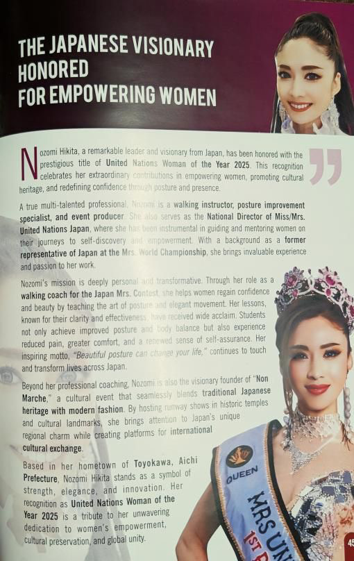 愛知県豊川市出身のウォーキング講師で姿勢改善の専門家、そしてイベントプロデューサーとしても活躍している疋田希望(ひきた のぞみ)さんが、世界大会「Miss & Mrs. United Nations World Pageant 2025」で「United Nations Woman of the Year 2025」を受賞しました♪