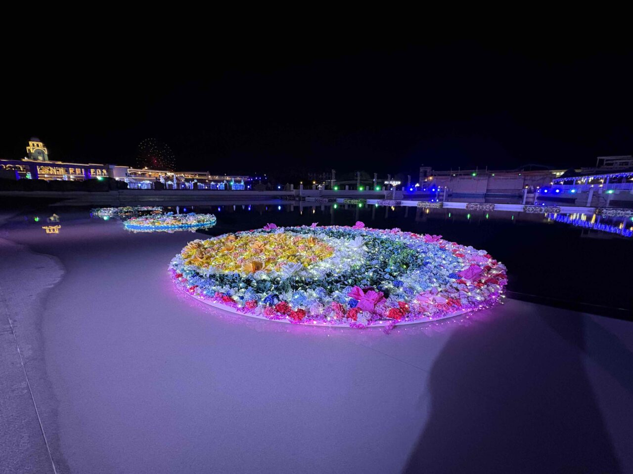 水上には花手水をイメージしたドローンが浮かび、上空には四つ葉のドローンが飛び回り、音楽に合わせて光が踊るんです。