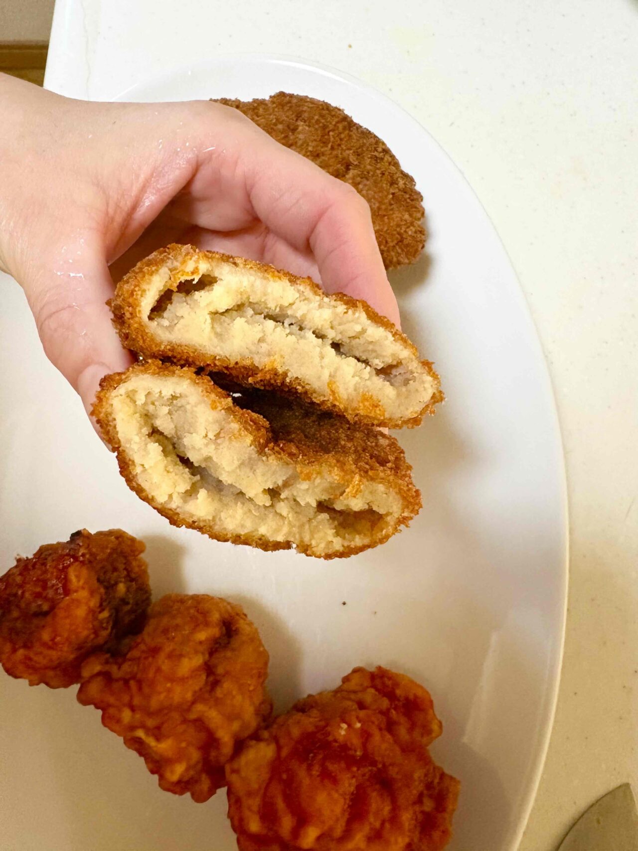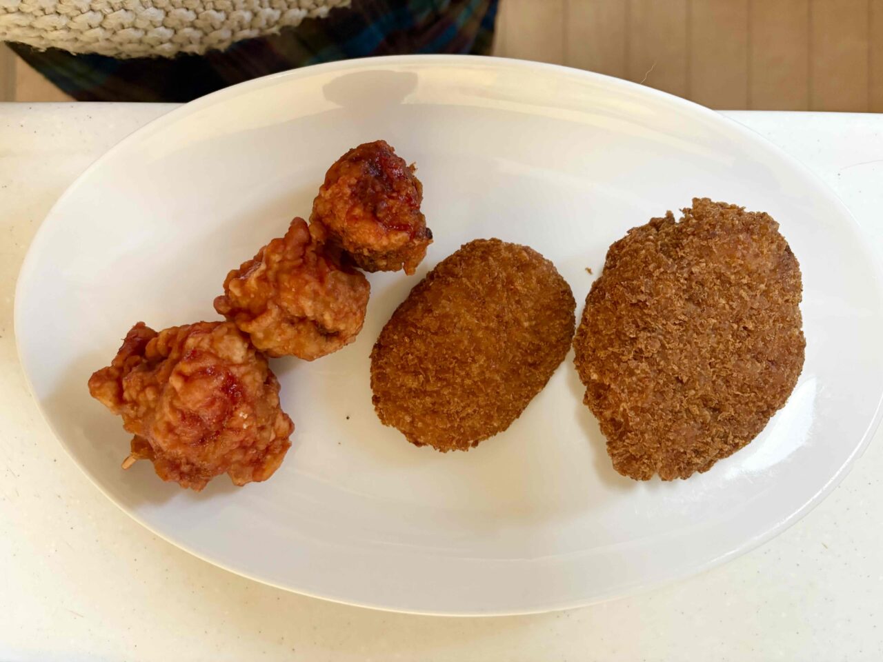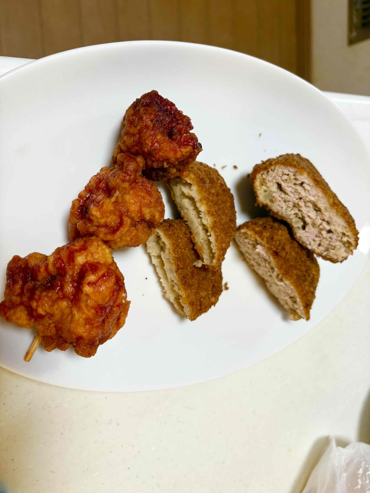 今回購入したのは、牛コロッケ(65円)、ミンチかつ(110円)、肉だんご(110円)。