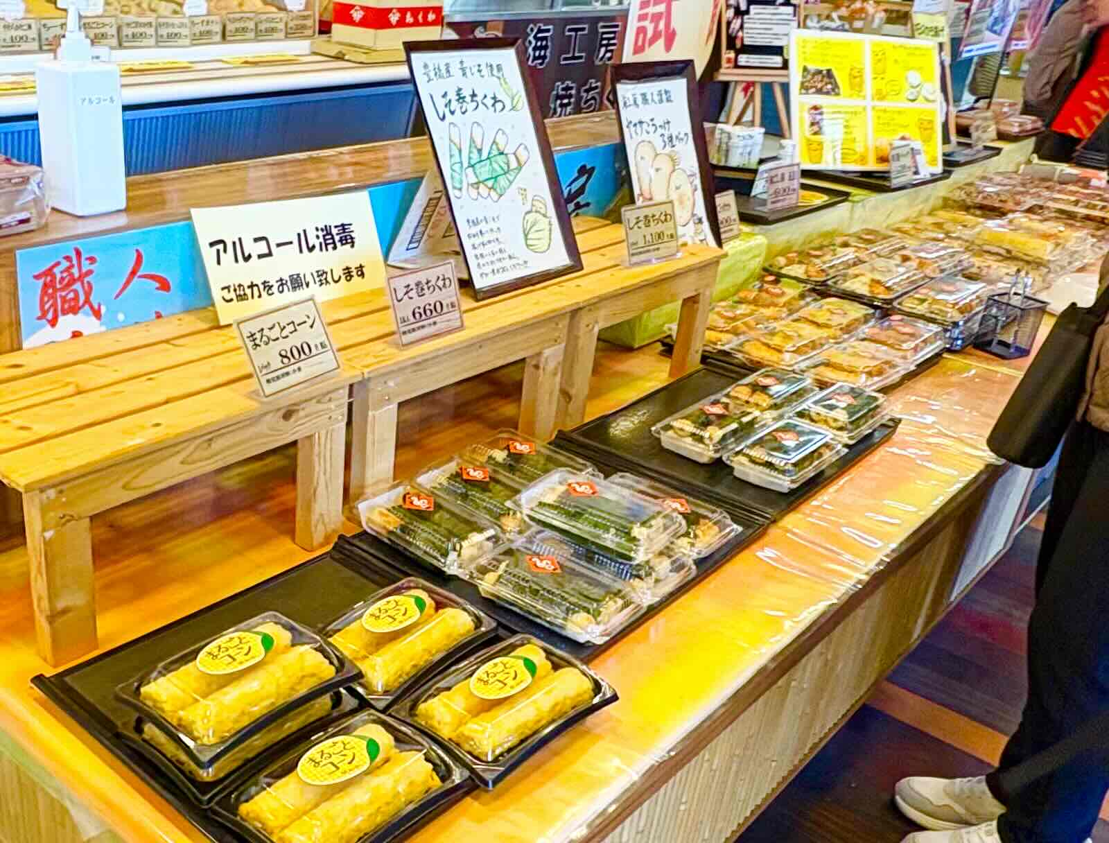 施設内の「ほの国市場」には、ヤマサ自慢のちくわをはじめ、各種練り物や東三河の特産品がずらり。