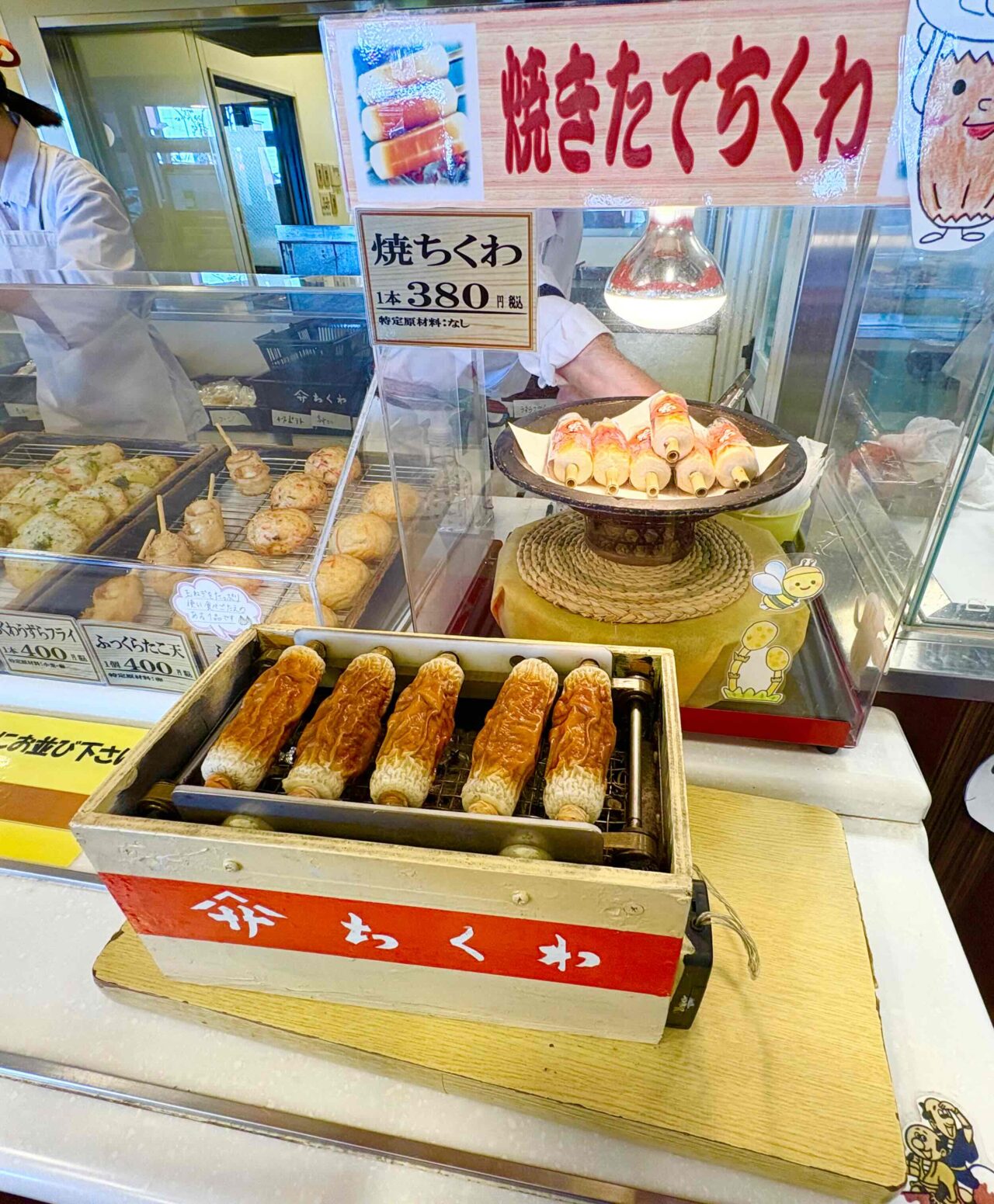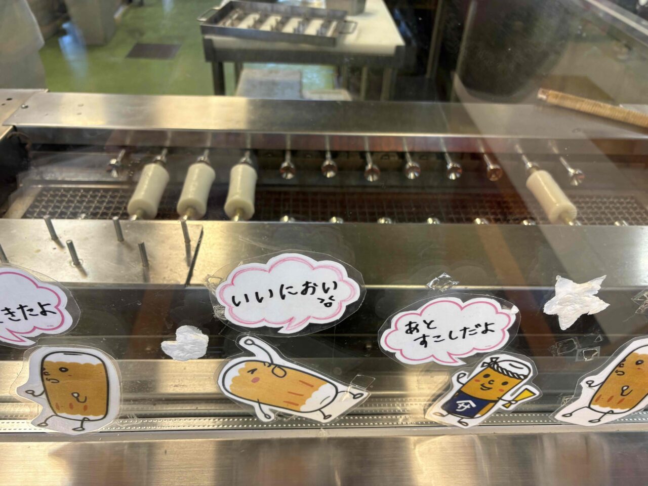 ガラス越しに、すり身をちくわの形に巻いていく様子や、だんだんと焼き色が付いていく工程を見ることができます。