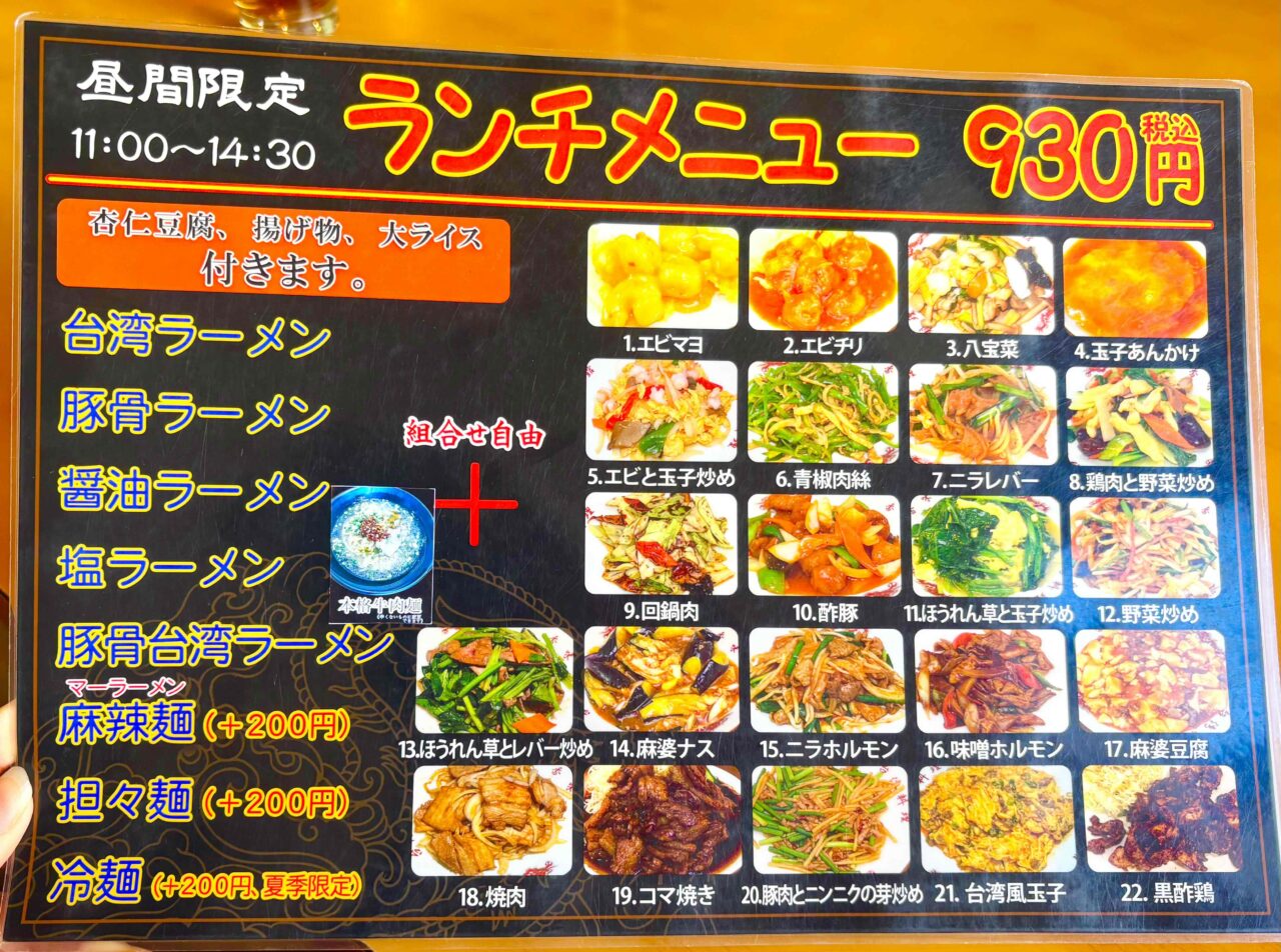 エビマヨ、台湾ラーメン、大ライス、揚げ物、杏仁豆腐。