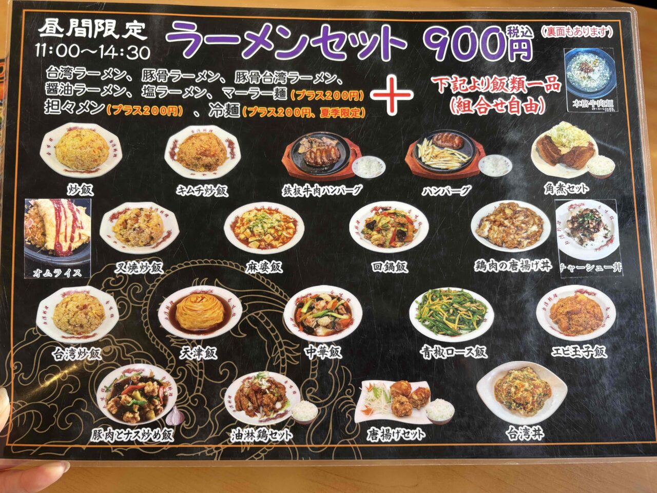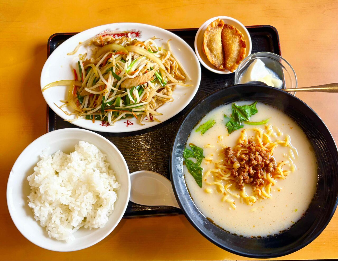 台湾豚骨ラーメン、ニラホルモン炒め、ご飯、揚げ物、杏仁豆腐。