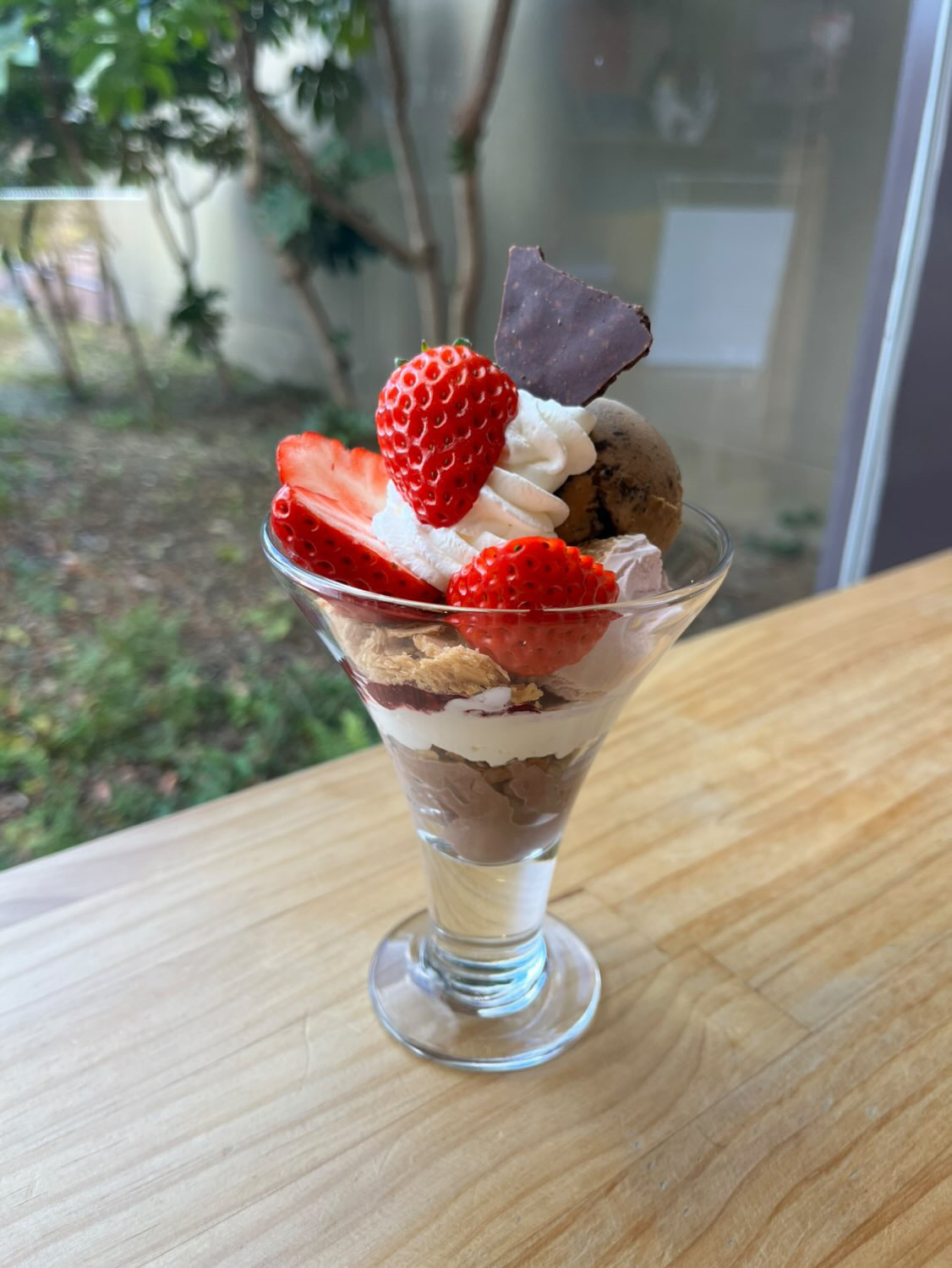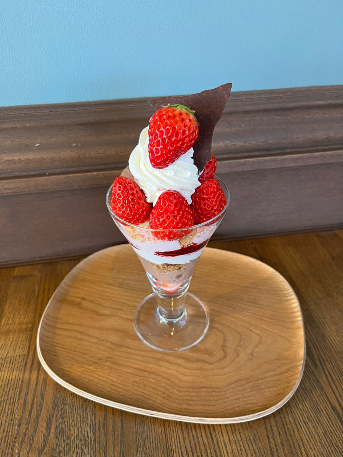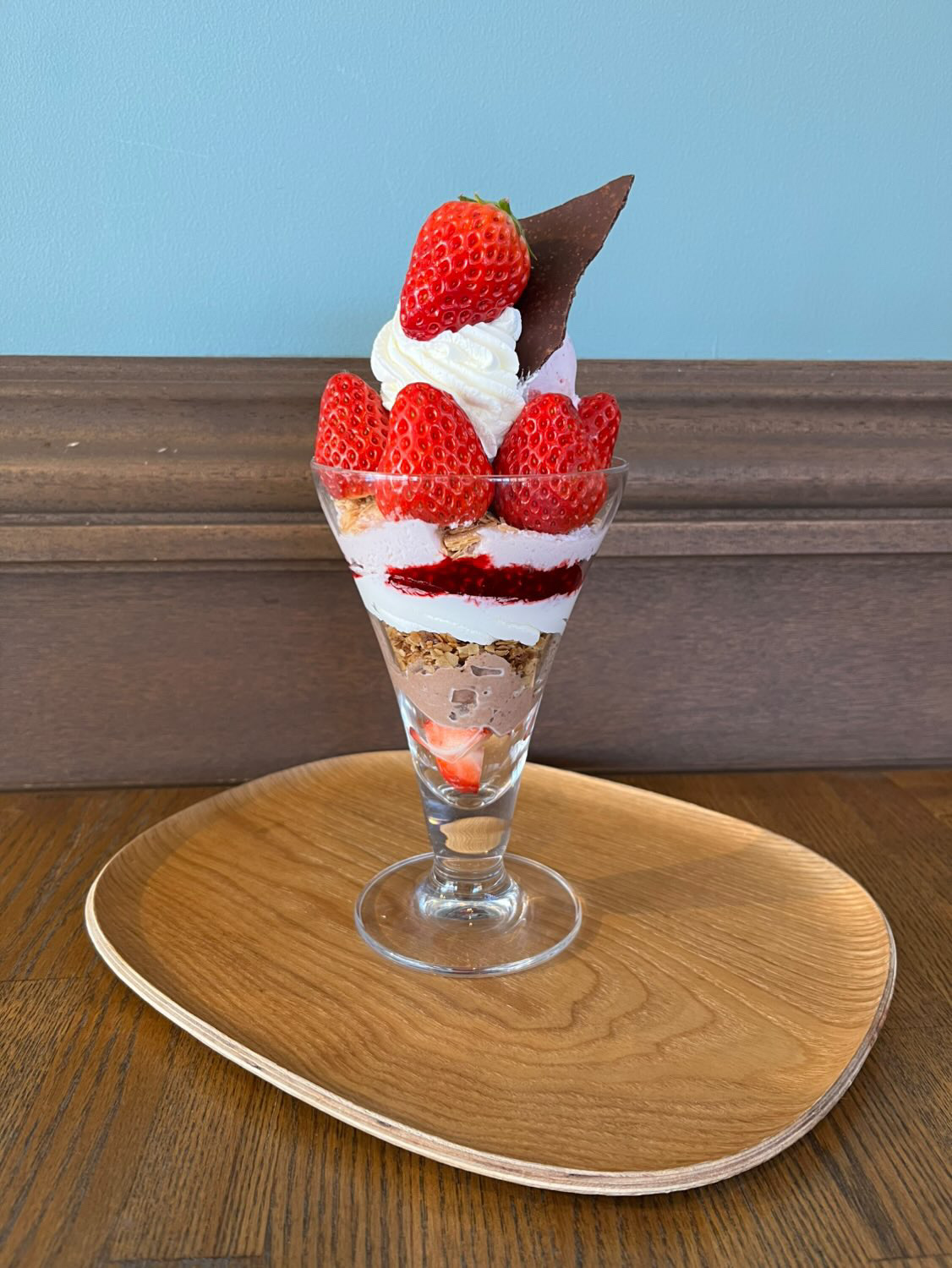 今回ご紹介するのは、「nido by honey bee project」のいちごパフェ(1,700円)。豊川市の山本いちご農園さんの紅ほっぺを使った、地産地消な一品です。