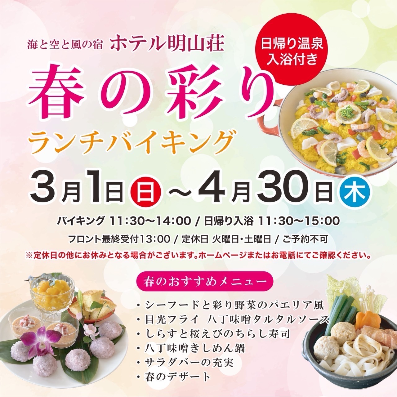 蒲郡市の三谷温泉にある「明山荘」では温泉入浴付きの「春の彩りランチバイキング」が開催されているんです♪