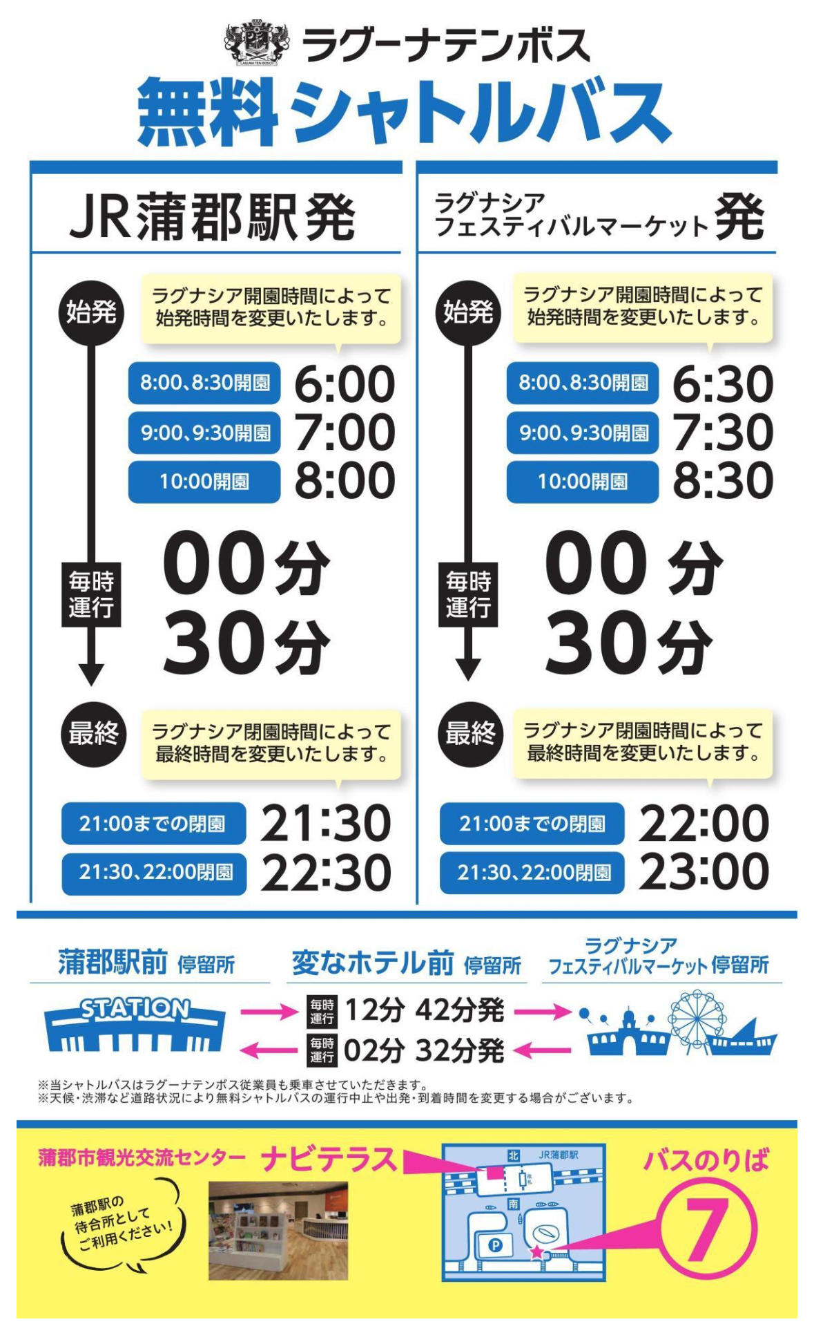 駐車料金は別途必要ですが、蒲郡駅から無料シャトルバスも運行しています。