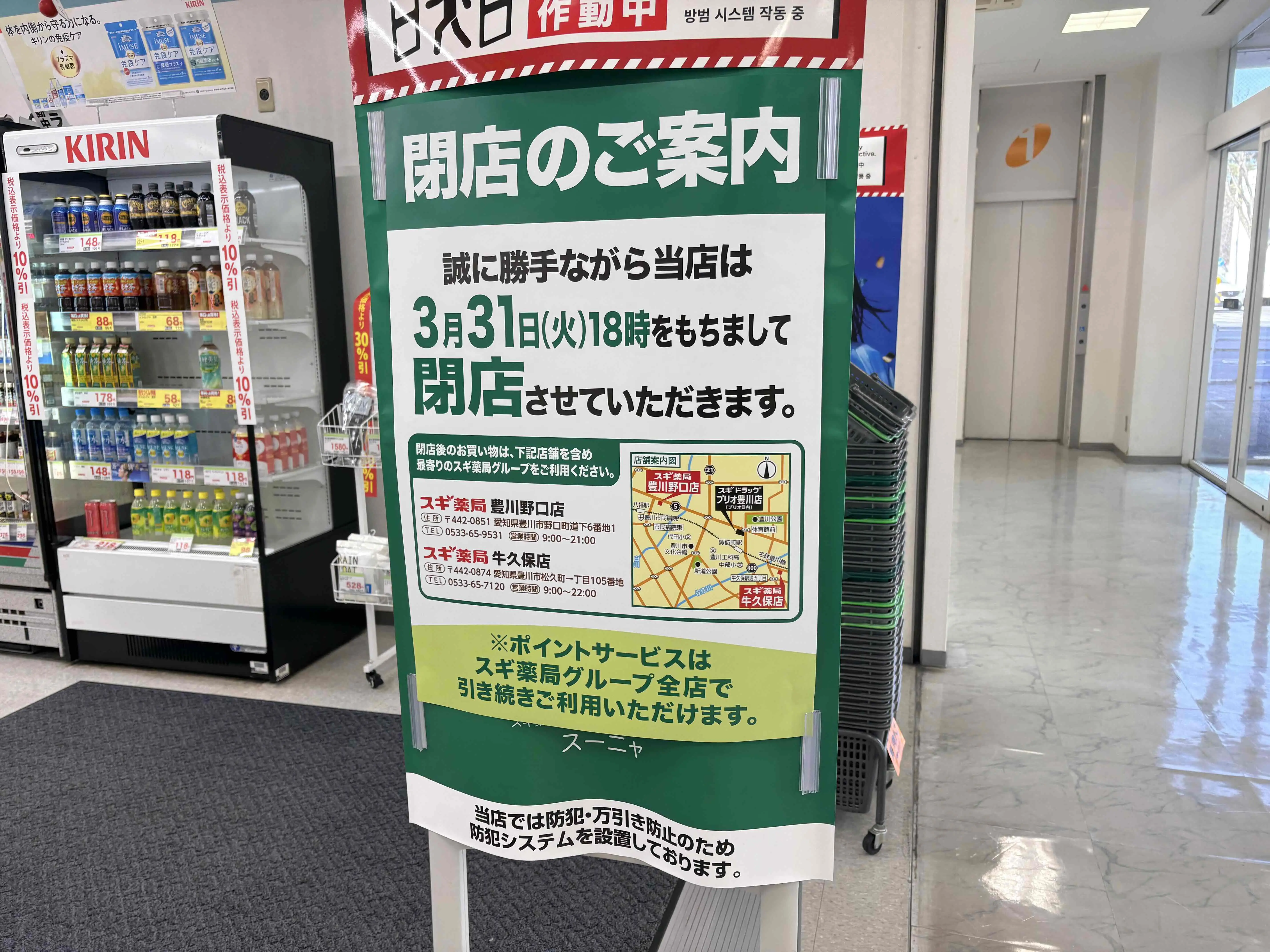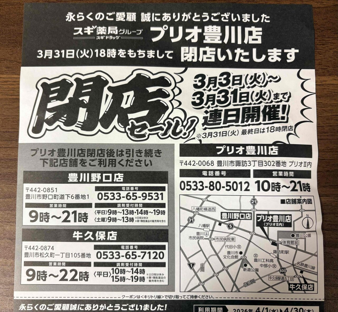 【豊川市】えっ本当に…!? スギ薬局 プリオ豊川店が3月末で閉店へ。現在閉店セール開催