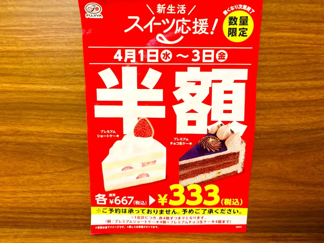 洋菓子チェーンの不二家で、毎回話題になる“ケーキ半額セール”が2026年も開催されています。