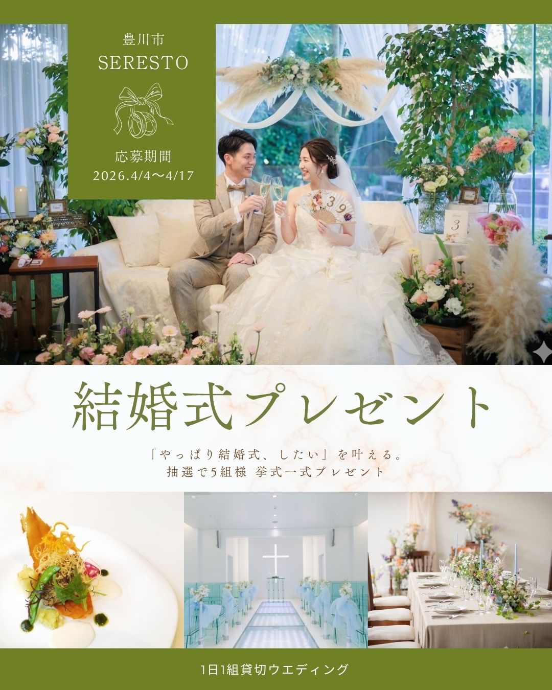 結婚式一式を無料でプレゼントという驚きの内容で、対象は東三河エリアの方の中から5組限定です。