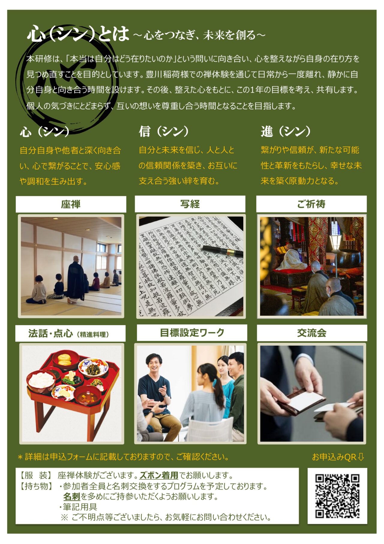 ・プログラム:座禅・写経・ご祈祷・法話・精進料理・目標設定ワーク・交流会
